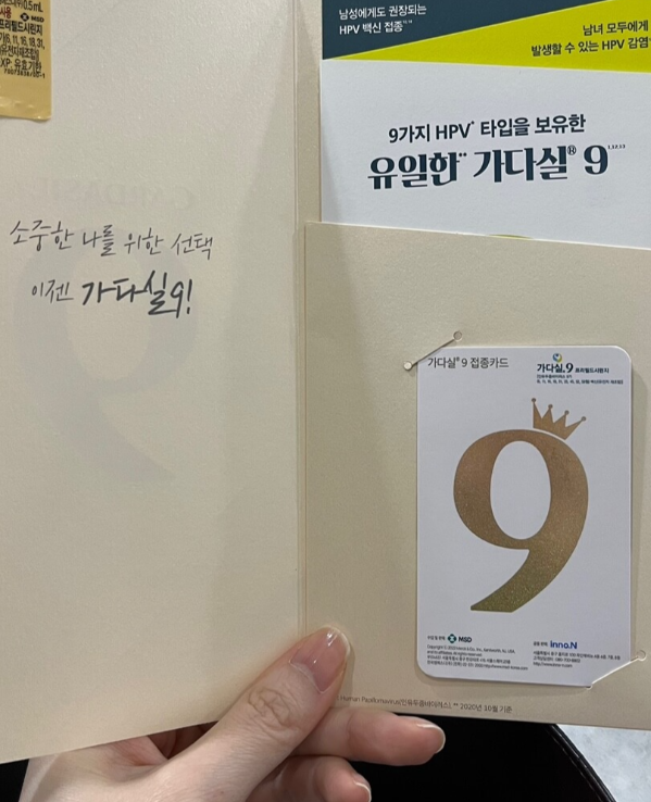 두둥. 드디어 진료실로 들어가서 원장 선생님께 설명을 듣고 가다실 9가를 냉장실에 꺼내어 보여주십니다. 가다실 9가 맞는지 확인시켜 주시는 거 너무 좋았어요. 코로나 백신처럼 팔뚝에 맞는데 진짜 아파요.. 약이 들어갈 때 묵직하게 좀 아픕니다.