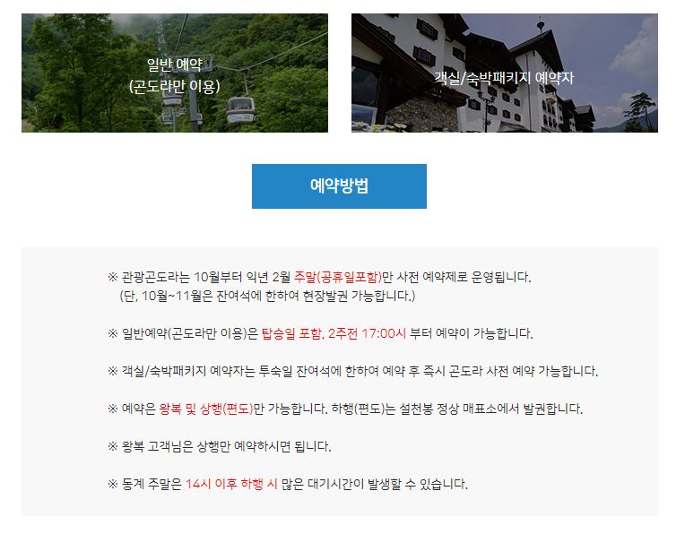 ✔ 곤도라는 10월부터 2월 주말(공휴일 포함)만 사전 예약제로 운영됩니다.