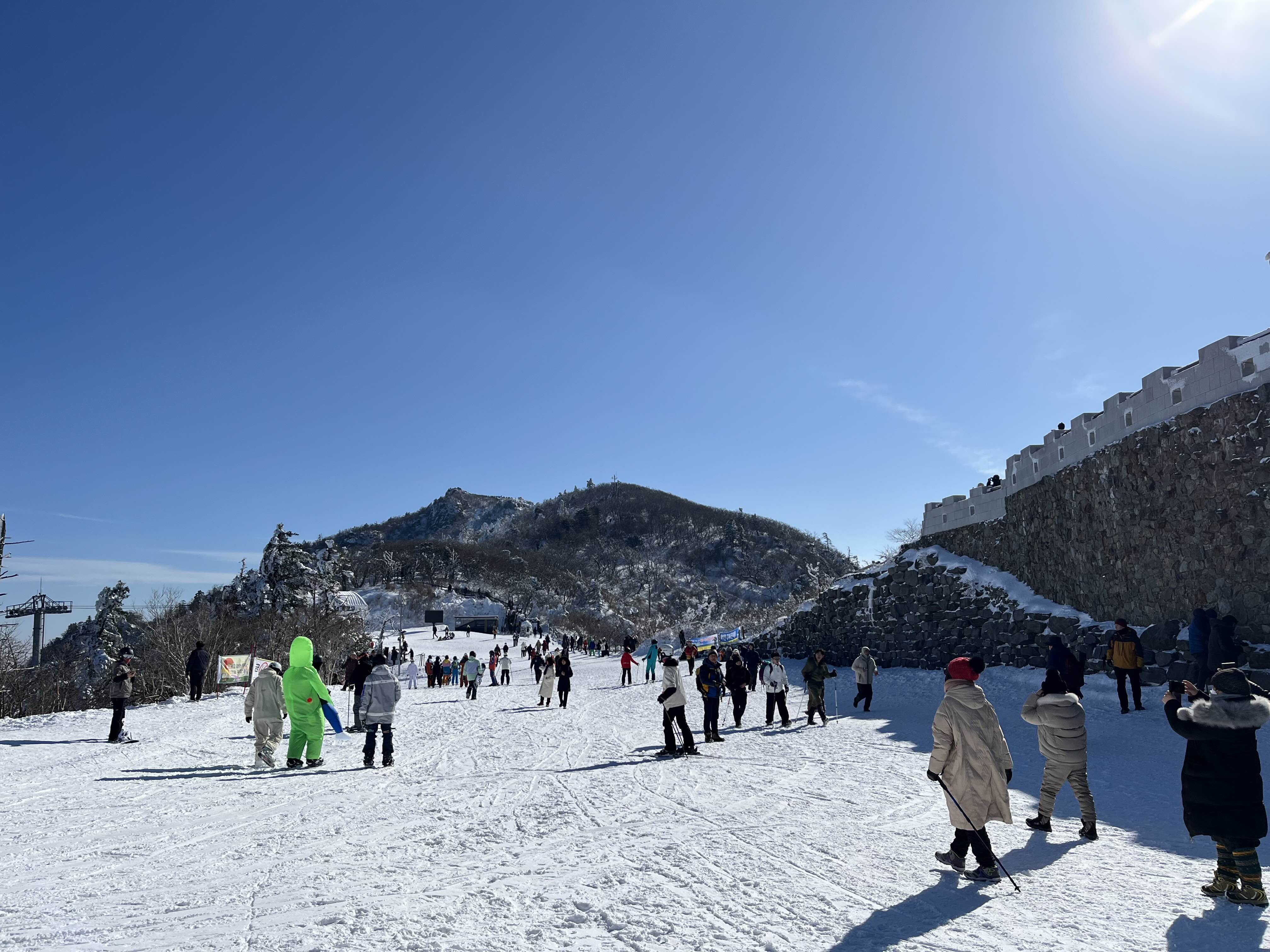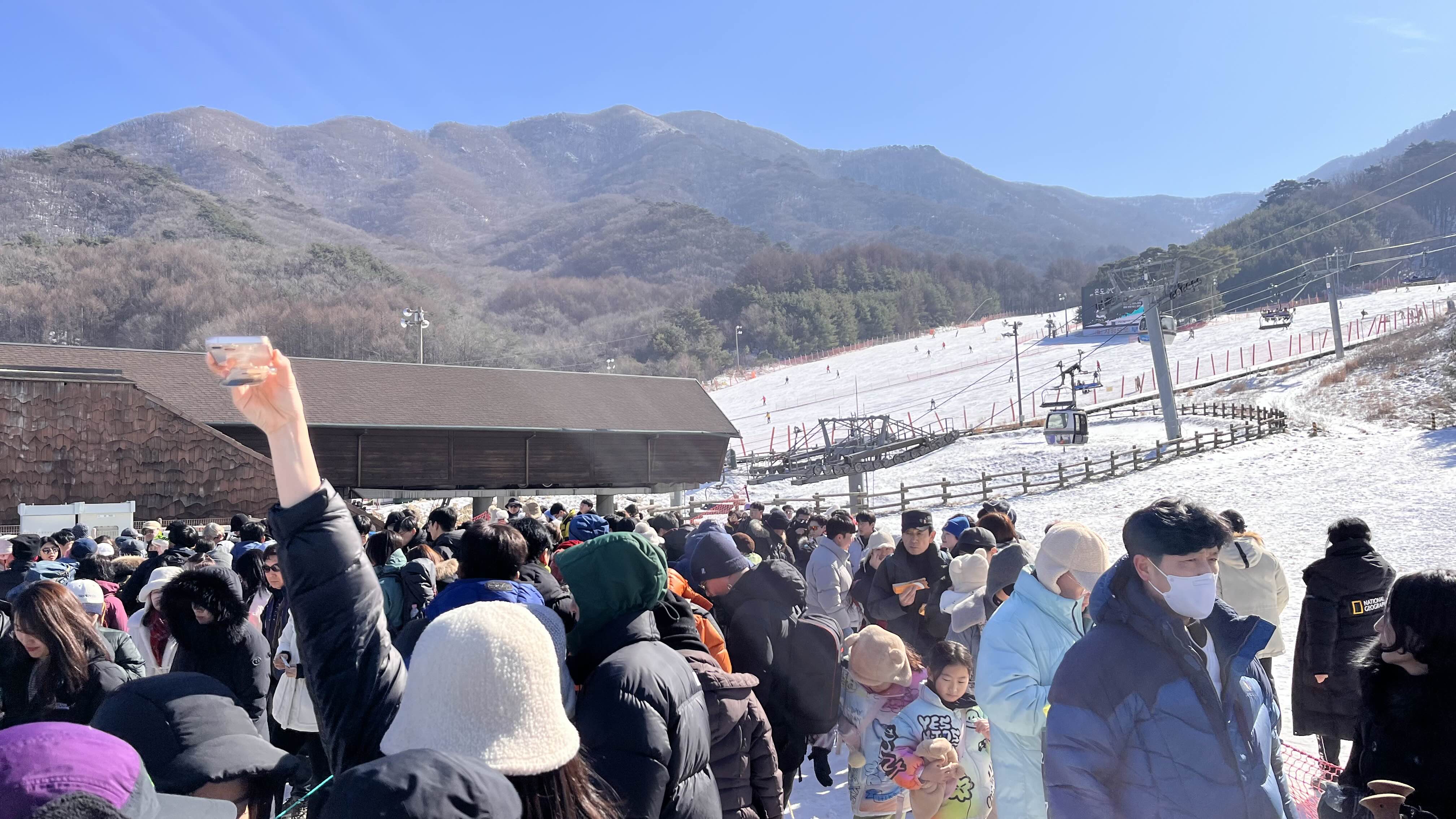 곤도라 승강장 대기에 줄을 섰는데 이때가 12시쯤이었어요. 직원이 1시간가량 대기해야 할 거라고 하셨는데 정말 1시간 10분 정도 걸렸네요. 곤돌라는 8인이 탑승을 하고요. 오를수록 설경이 아주 멋지더라고요. 스키 타는 사람들도 구경하고 설경도 감상하며 사진 찍고 그러니 금방 도착합니다.