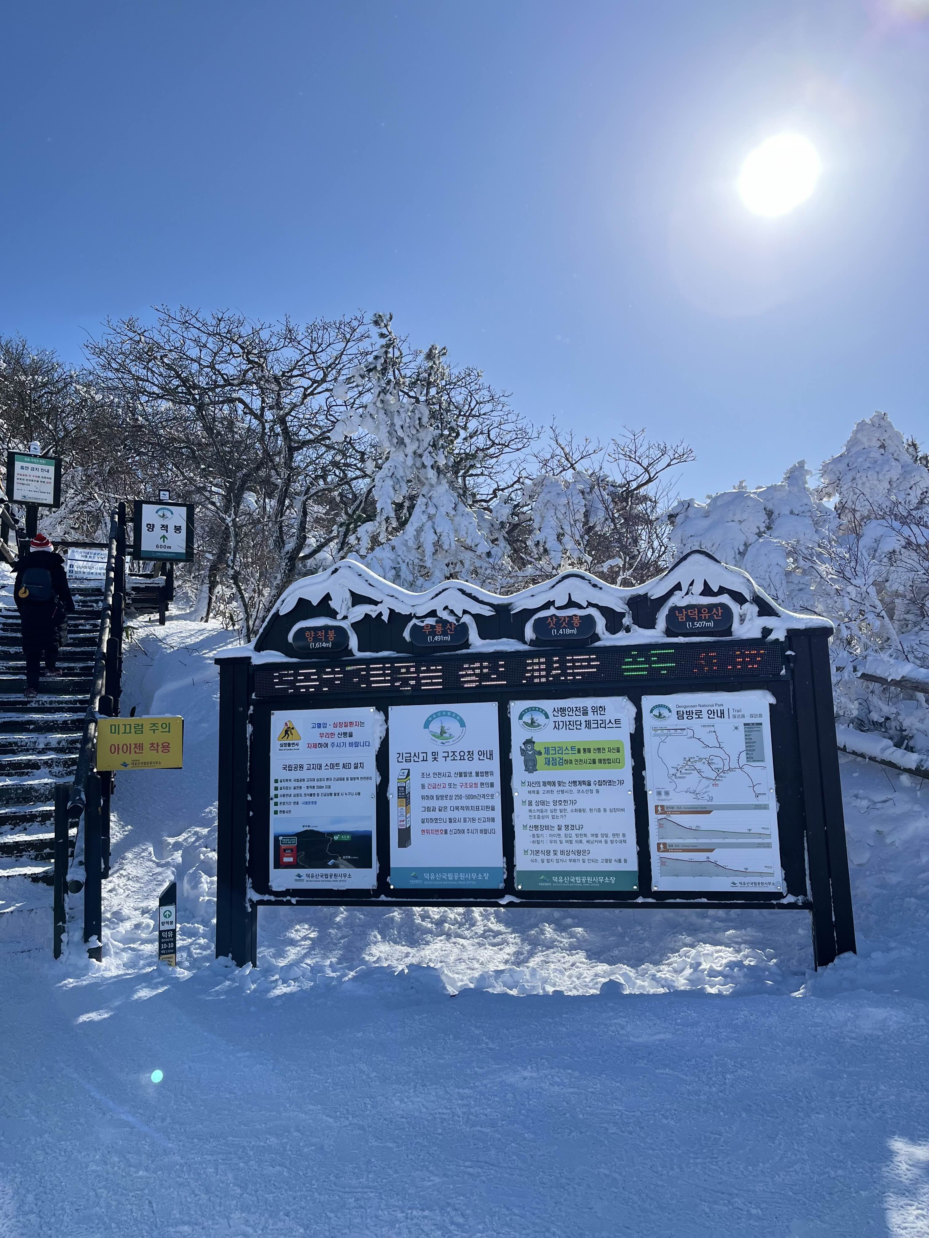 전 집에서 아이젠, 스패츠, 장갑, 모자, 넥워머, 보온병 등 만만의 준비를 하고 챙겨갔어요. 움직일 때는 괜찮은데 조금 쉬고 있으니 또 춥더라고요. 방한용품 필수로 챙겨가세요. 대여점도 있으니 참고하세요. 아이젠 없이 오르는 분이 있던데 정말 조심해야 합니다. 미끌어 넘어질 수 있어요. 아이젠은 필수입니다.