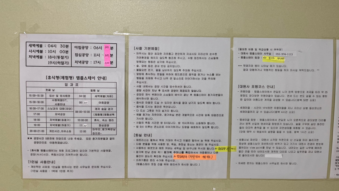 제가 아침은 안 먹는 게 습관이기도 하고 패스하고 싶어서 전날 밤에 아침공양은 생략하겠다고 문자를 드렸어요. 스님이 공양시간에 인원을 다 체크하고 식사하도록 챙기신다고 하시더라고요.