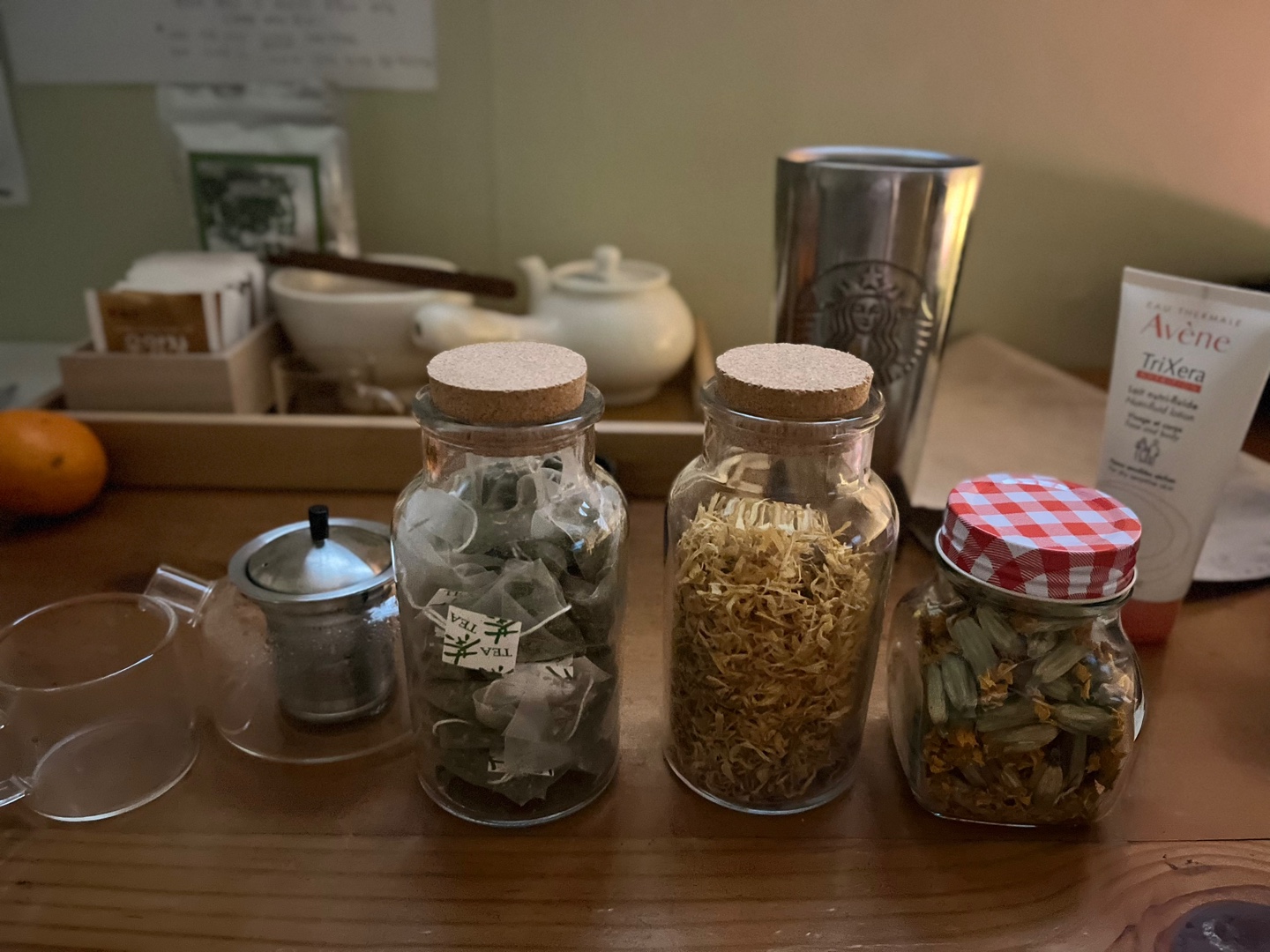 방이 아주 깨끗했고 테이블에 차와 다기가 올려져 있는데 이 또한 너무 이뻤어요. 물을 끓일 수 있는 커피포트도 있고요.