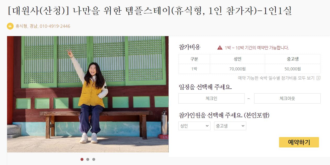 경남 산청 대원사 1인실 체험형은 성인 8만 원, 휴식형은 성인 7만 원으로 비용이 저렴합니다. 비용은 사찰과 프로그램에 따라 차이가 있으니 비교해 보고 예약하세요. 확실히 주말은 빨리 예약 마감이 되더라고요.