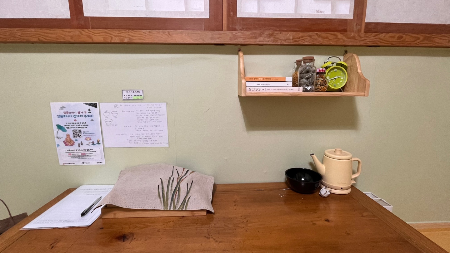 전 휴식형이라 오리엔테이션과 공양시간 외에 예불 시간은 자유롭게 선택했어요. 방으로 돌아와 테이블에 올려져 있던 다기로 차를 끓여마셨어요. 저 멀리서 목탁소리가 들리고 방은 아늑하고 따뜻했어요.