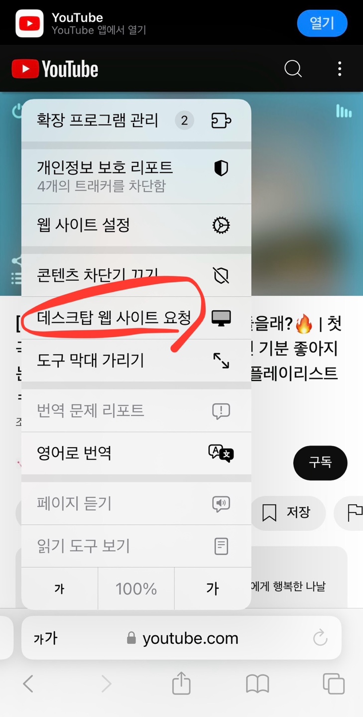 하단에 '가가'를 선택해 주세요. '데스크톱 웹사이트 요청'을 선택하면 웹 화면으로 바뀝니다.