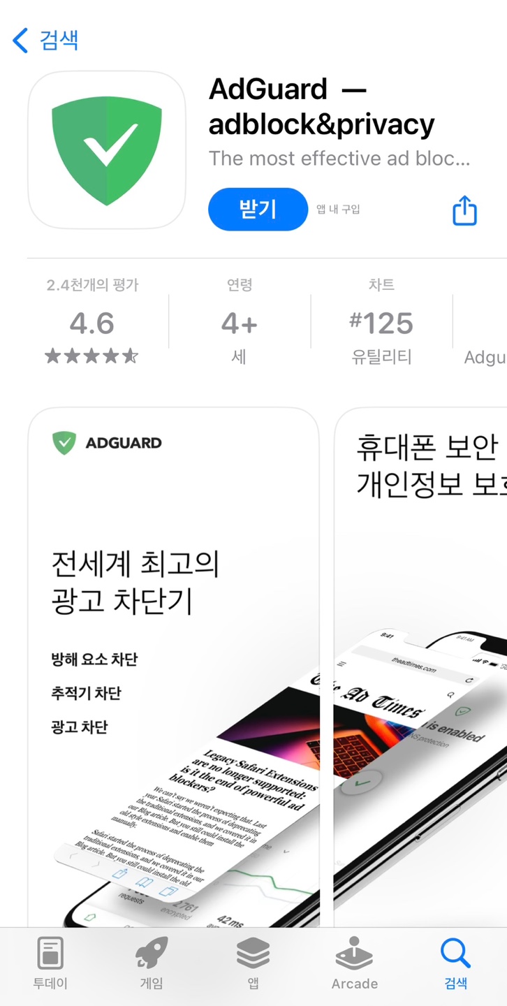 앱스토어 또는 구글플레이 스토어에서 '애드가드'를 검색하여 다운로드 합니다.