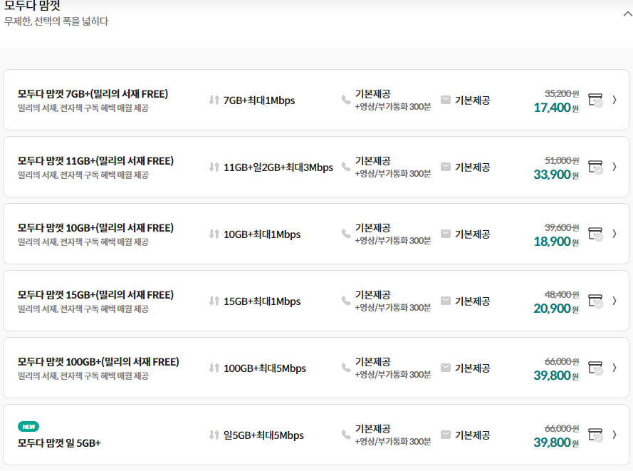 제가 선택한 요금제는 '모두다 맘껏 15GB+(밀리의 서재free)'입니다. 데이터 15기가에 데이터쉐어링도 가능한데 요금이 20,900원입니다. 확실히 알뜰요금제가 저렴하긴 하죠!!