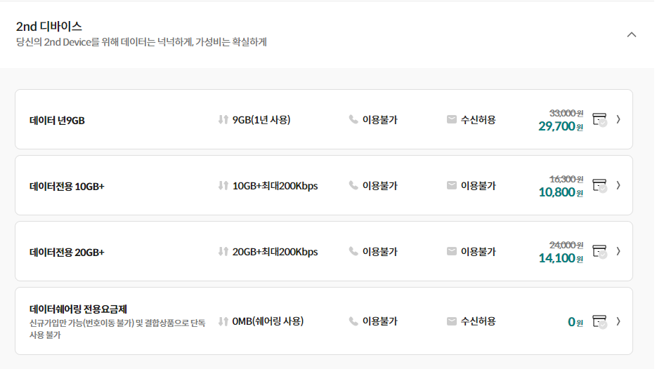'2nd 디바이스'요금제는 패드, 에그, LTE기가지니, 액션캠, LTE노트북 등 사용이 가능하며 유심만 구매하여 사용이 가능한 요금제입니다.
