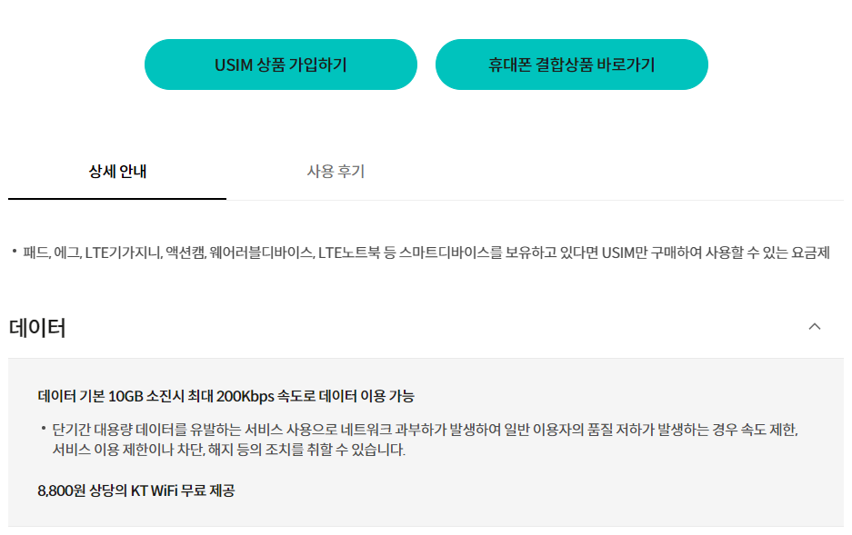 기본 제공되는 데이터를 모두 소진하면 200kbps 속도로 이용이 가능하다고 합니다.