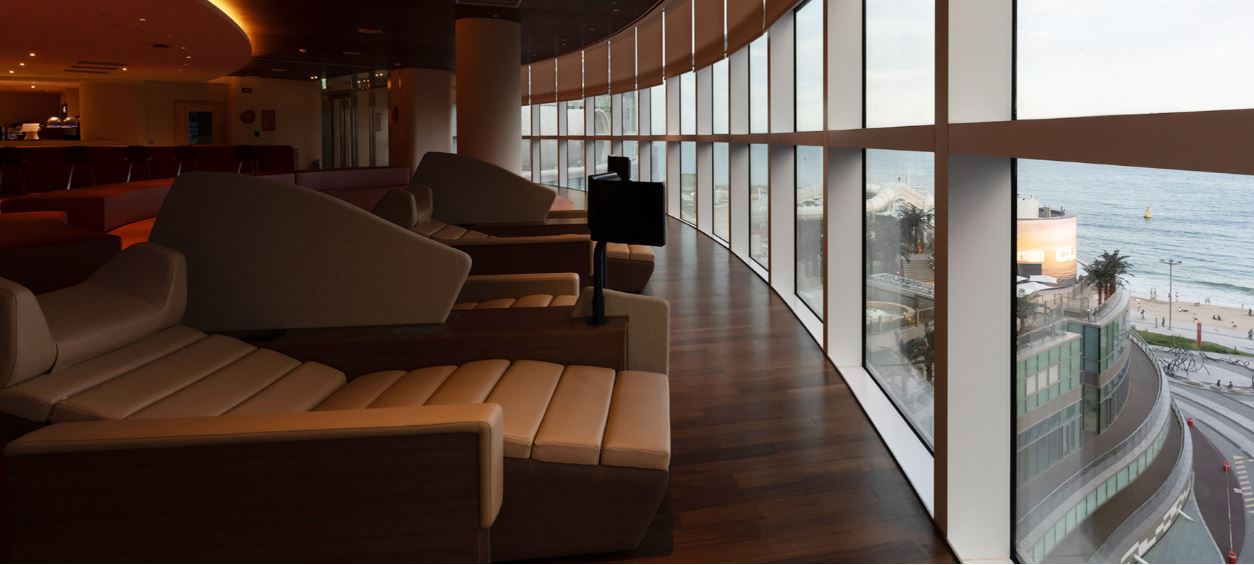 3층은 로비, 4층은 실내와 실외 워터파크, 5층과 6층은 바다와 도심 풍광을 모두 감상할 수 있는 사우나, 노천탕을 갖추고 있어요.