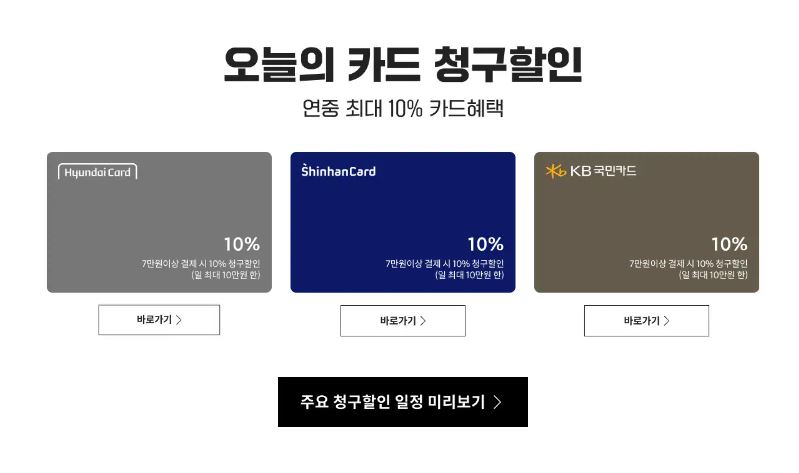 현대카드, 신한카드, 국민카드로 7만원이상 결제 시 10% 청구할인 이벤트도 진행 중이니, 할인 쿠폰 및 할인 카드 혜택을 잘 확인하시고 알뜰쇼핑 하시길 바랍니다.