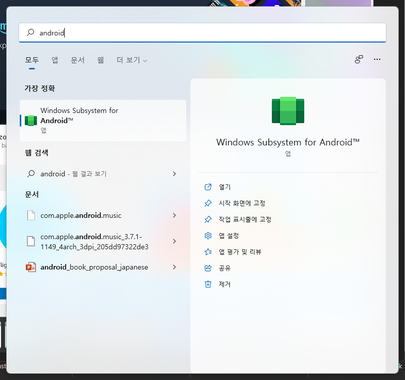 Microsoft Store와 Amazon Appstore 연동으로 일부 Android 앱을 윈도우 환경에서 실행할 수 있습니다.