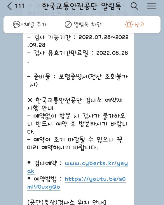 지난번 빠르게 검사를 받았고 편했던 기억이 있어 해운대 자동차검사소로 예약했습니다. 가까운 날짜는 예약이 안되어 10일 뒤쯤 예약했는데 검사 당일 카톡 알림이 와서 잊지 않고 갈 수 있었습니다. 이런 알림 좋습니다.