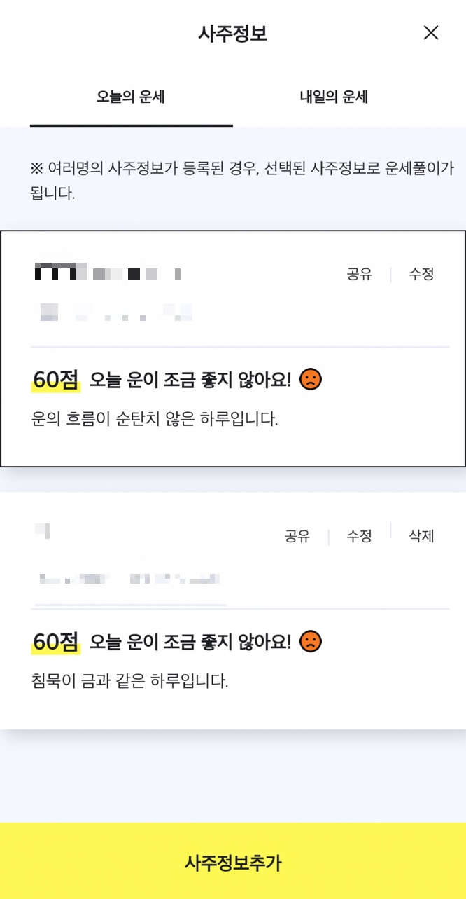 이름과 생년월일, 태어난 시간, 성별을 입력하면 바로 나의 운세를 확인할 수 있는 장점이 있으며, 여러 명의 사주정보가 추가가 되어 바로바로 확인이 가능한 것이 편했어요.