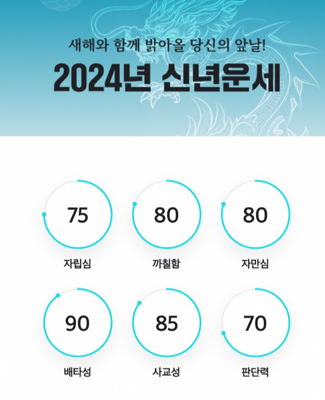 2024 신년운세를 조회해 보면 자립심, 까칠함, 자만심, 배타성, 사교성, 판단력이 수치로 나옵니다. 제가 많이 까칠하고 자만심이 있나 봅니다. 까칠한 건 저도 인정해요 ㅎㅎㅎ