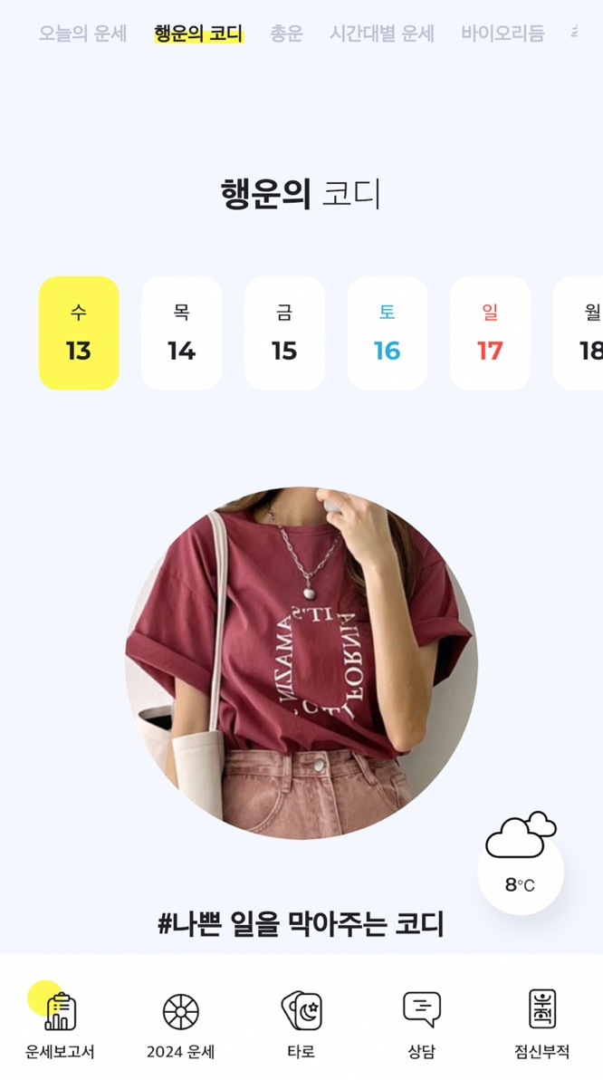 오늘의 운세와 행운의 코디, 총운, 시간대 별로도 보실 수 있습니다. 정말 다양해요. 총운을 검색해 보시면 재물운, 연애운, 사업운, 건강운, 학업운까지 자세히 보실 수 있어요. 재밌더라고요.