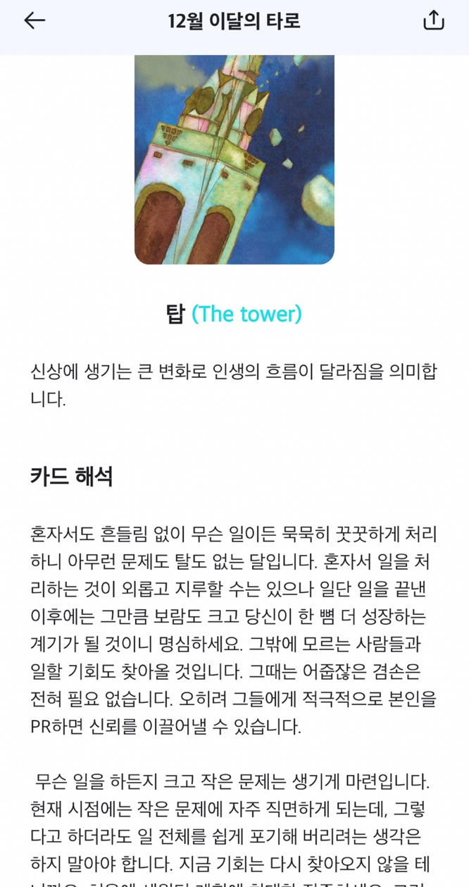 이달의 타로를 보았는데 카드를 보여주고 카드 해석을 해주는데 꽤나 자세하게 풀이를 해 줍니다. 참고할 건 참고하고 주의해야 할 부분은 주의하게 되더라고요.