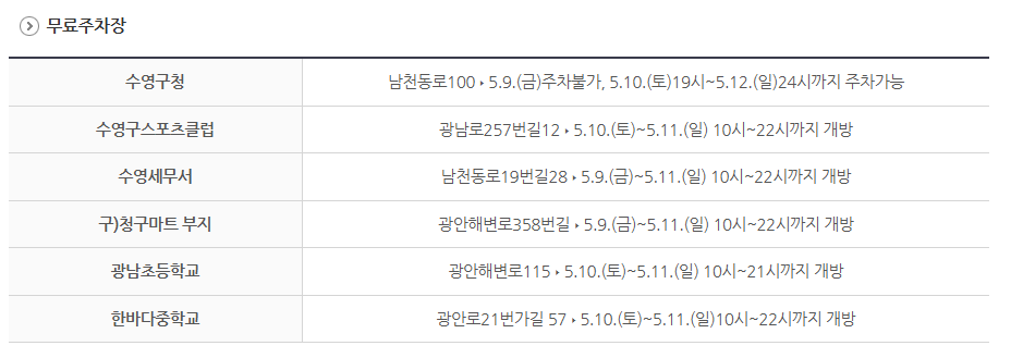 • 수영구청, 수영세무서, 광남초등학교, 한바다중학교 등 일부 개방 (일정 참고)
